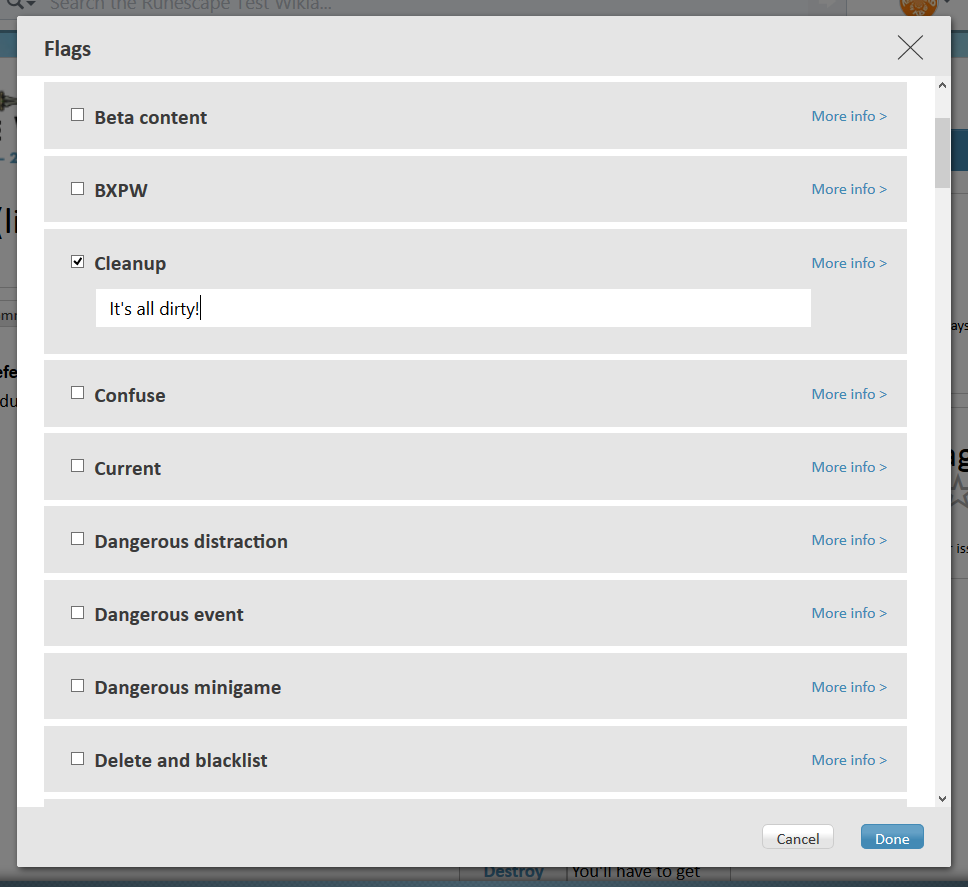 </p><p>Other potential ideas include mobile users easily being able to mark pages that need work (e.g. you notice a page is full of typos, and flag it for yourself or others to improve later), or even modifying how the page behaves based on the flags (e.g. hiding spoiler article text from on-Wikia search results). If you have more ideas around this, we’d love to hear them.