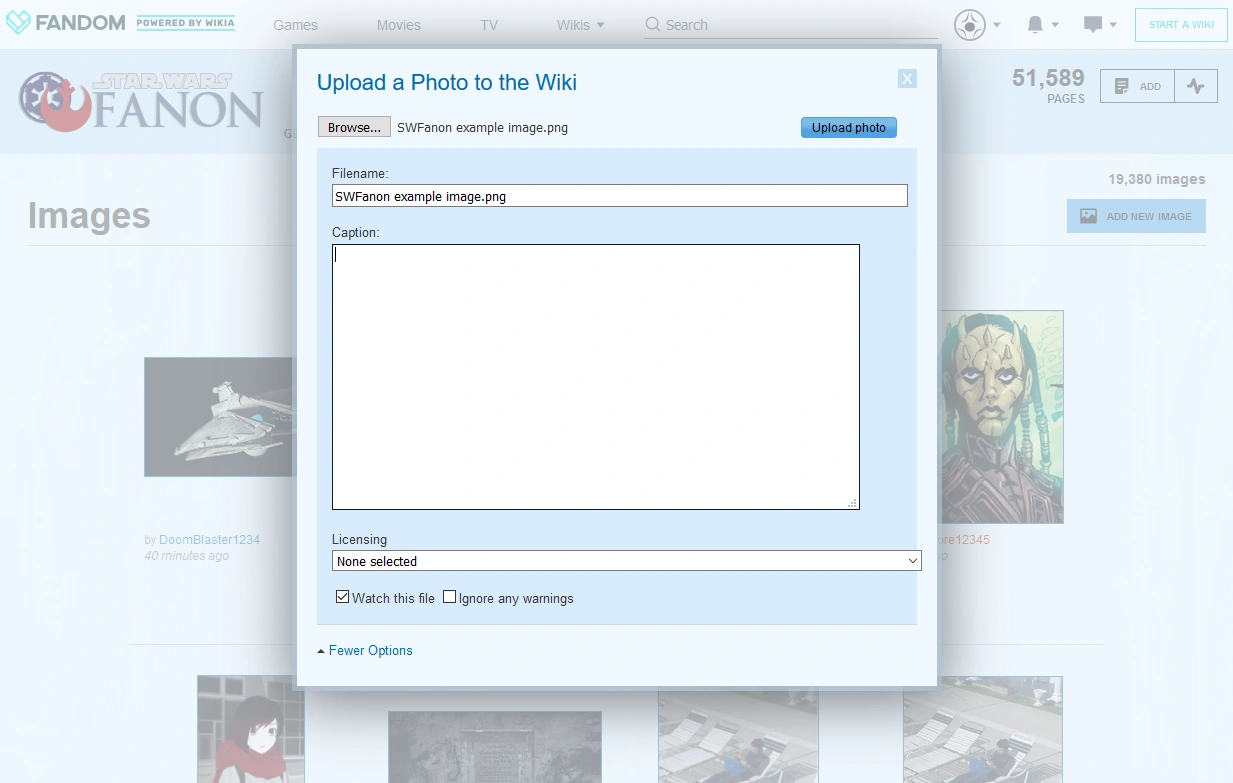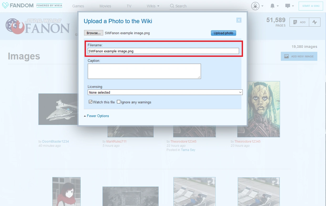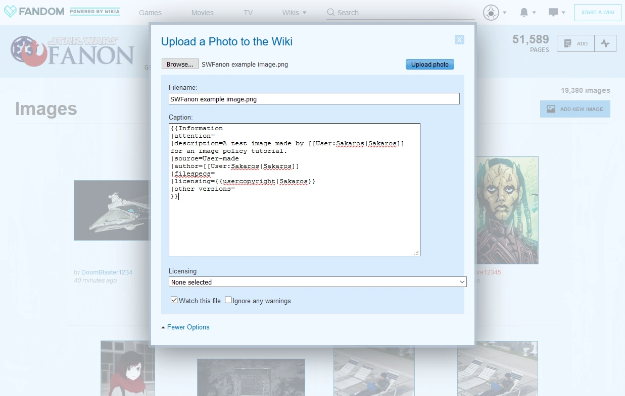 - If you're linking to something on Star Wars Fanon (which should only occur in the description or if you're linking back to your user page; SWFanon is never a source!), enclose the link in double brackets. E.g.,