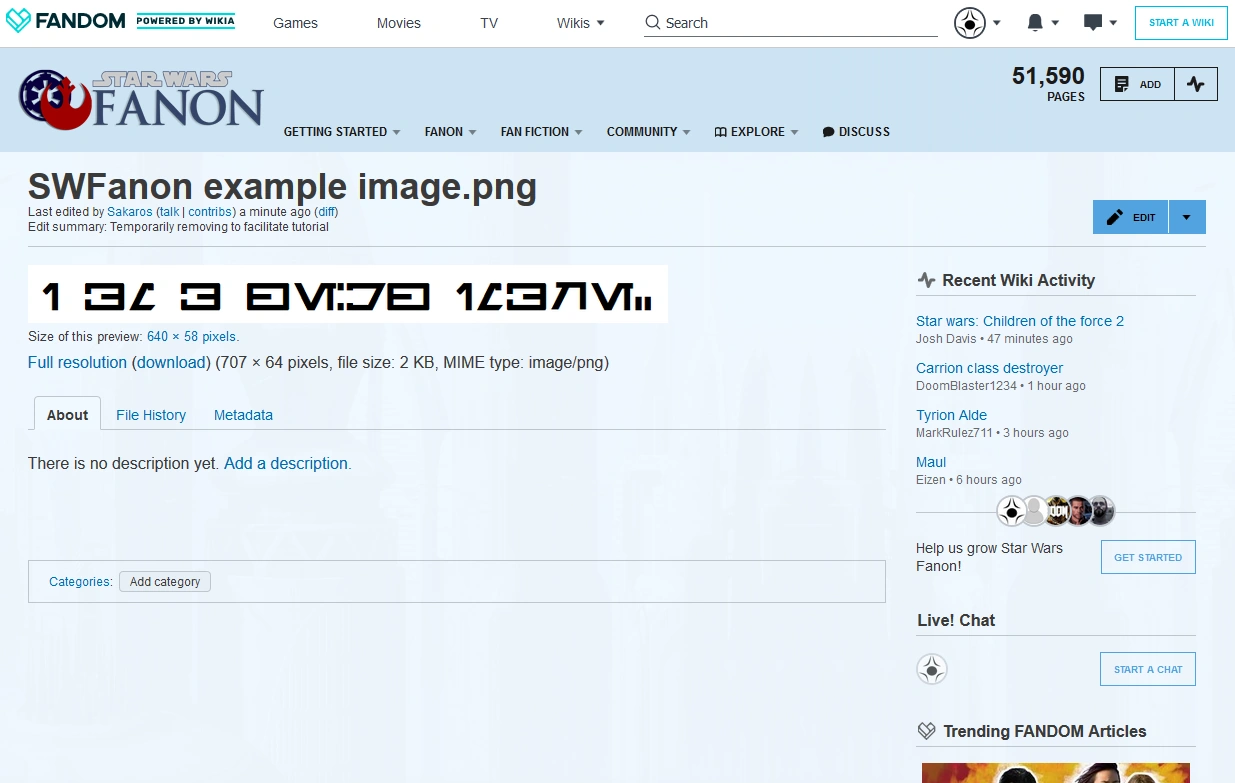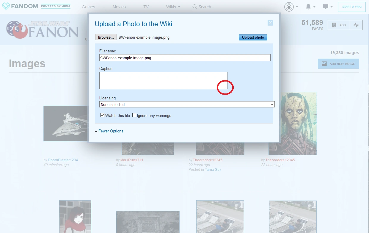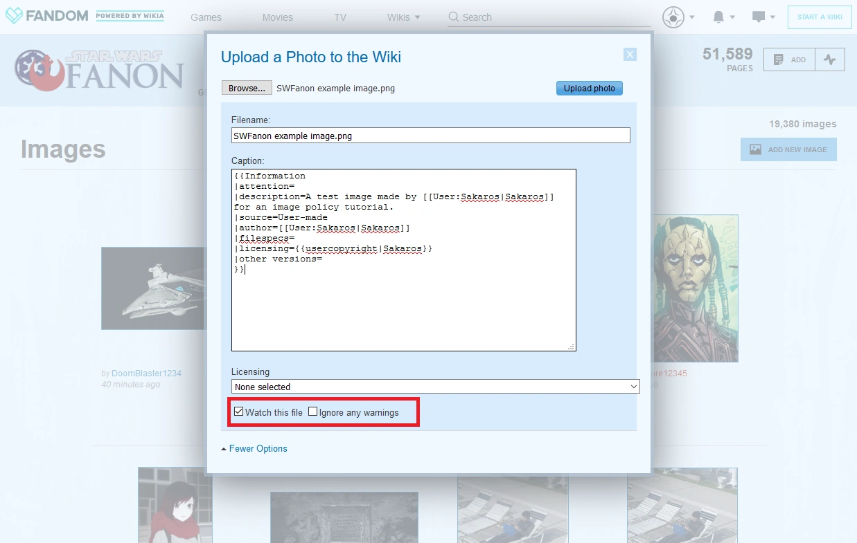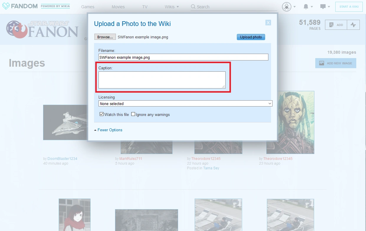 - If you're linking to something on Star Wars Fanon (which should only occur in the description or if you're linking back to your user page; SWFanon is never a source!), enclose the link in double brackets. E.g.,