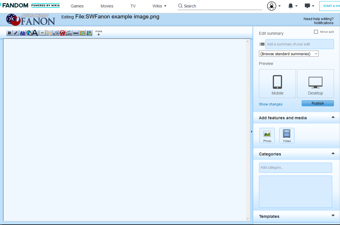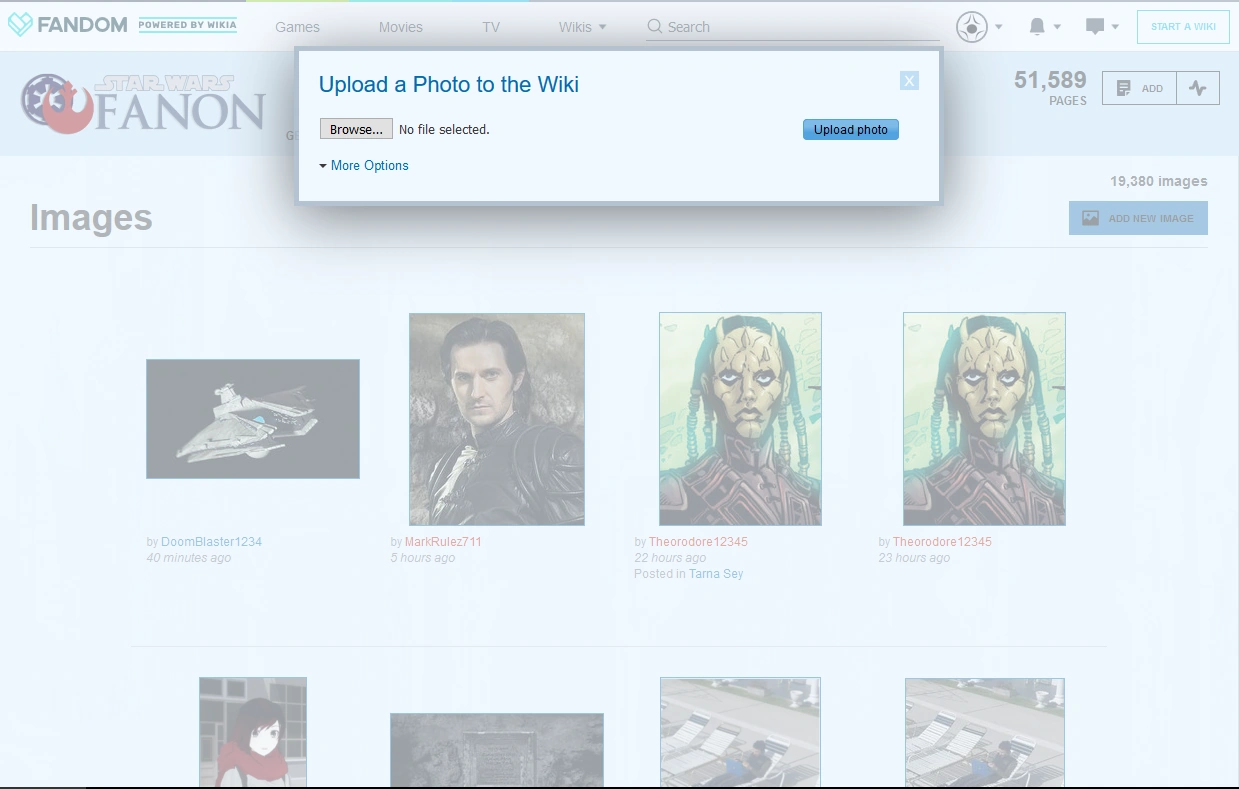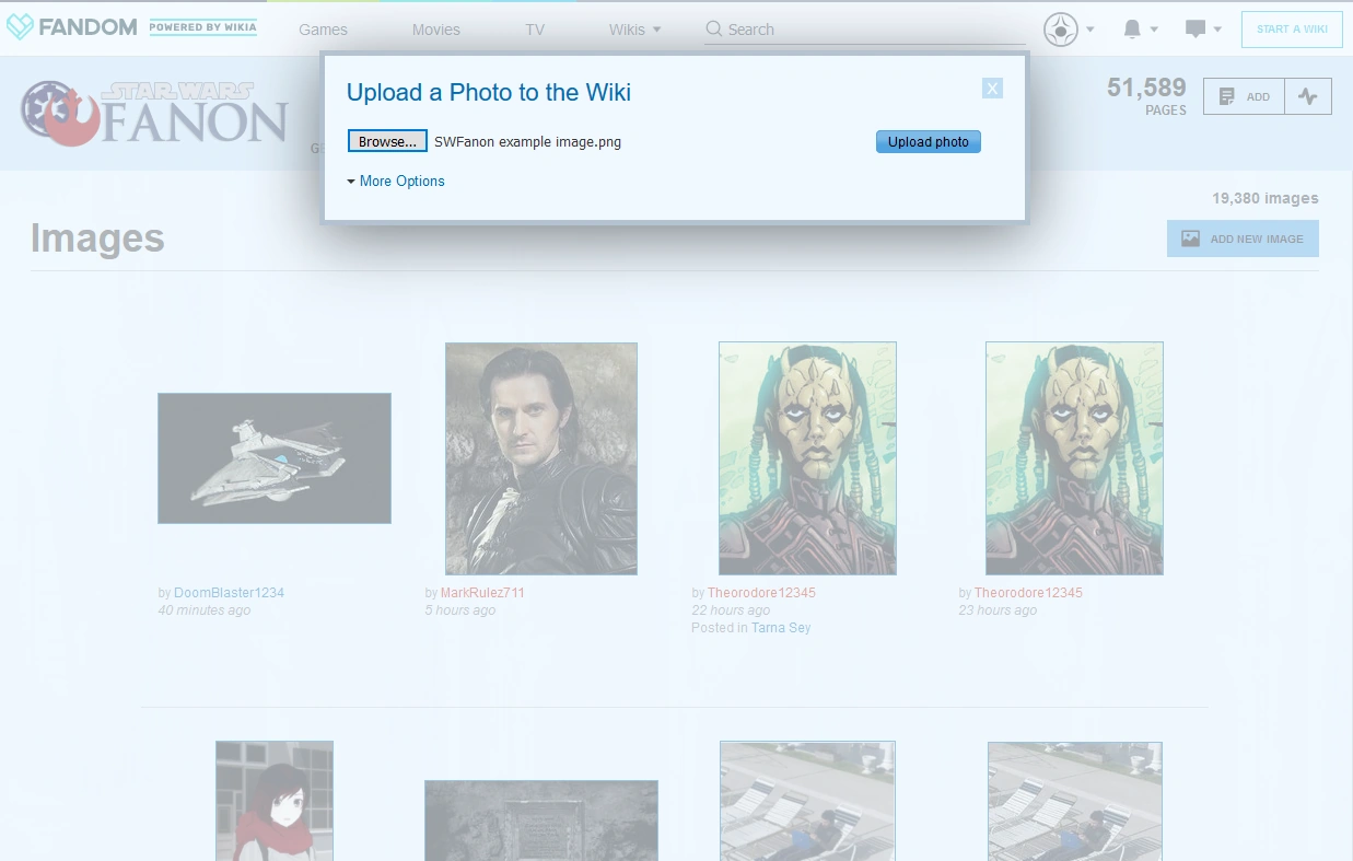 Great! Although most people who peruse Star Wars Fanon are readers by nature and have vibrant imaginations, sometimes there really is no way to capture the details of a character or scene like providing an actual, visual representation. Images add flavor to articles and help readers visualize characters, allowing them to "see" the action as they read articles. Used properly, images can be an important component of an article.