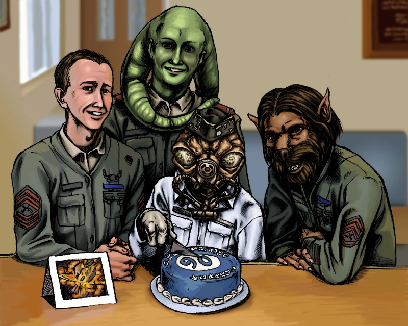 A retired GySgt Tuffass with three Marines, circa 3,928 BBY