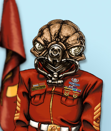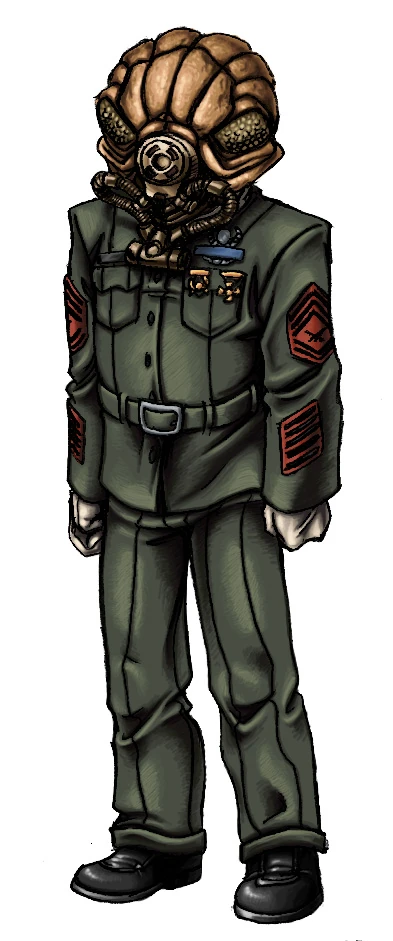 Gunnery Sergeant Tuffass, service number 3137-0666TA, was a male Gand from the planet Gand and one of the very first of his kind to encounter the Galactic Republic. He enlisted in the Marine Corps under the name "Gand" some years prior to the Great Sith War, as at the time, he had not yet earned his identity. Despite having little knowledge of Basic at the outset of his training, Tuffass learned quickly enough so that by the time he graduated from boot camp, his language skills were as good as his fellow Human recruits. Further training gave him a proficiency with explosives and his prior findsman training served him as an uncanny recon scout. Having achieved the rank of corporal by the onset of Exar Kun's war, Tuffass was deployed with the 4th Marine Division's 12th Marine Regiment. During the war's final battle at Yavin 4, the as-yet-nameless Gand served as a fire-coordinator for his battalion. He lost his left arm and leg in a surprise counterattack on the landing zone by a group of Massassi warriors. Though grievously wounded, he insisted on continuing to call in strikes, which earned him the Distinguished Service Order for bravery, in addition to the Crimson Cross.